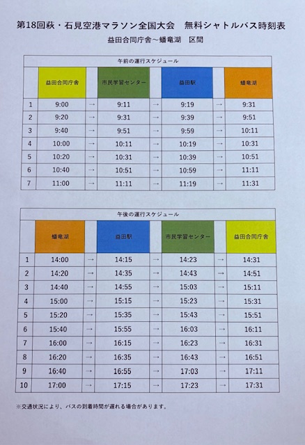 萩・石見空港マラソン全国大会では、駐車場や周辺からの無料のシャトルバスを運行しています。